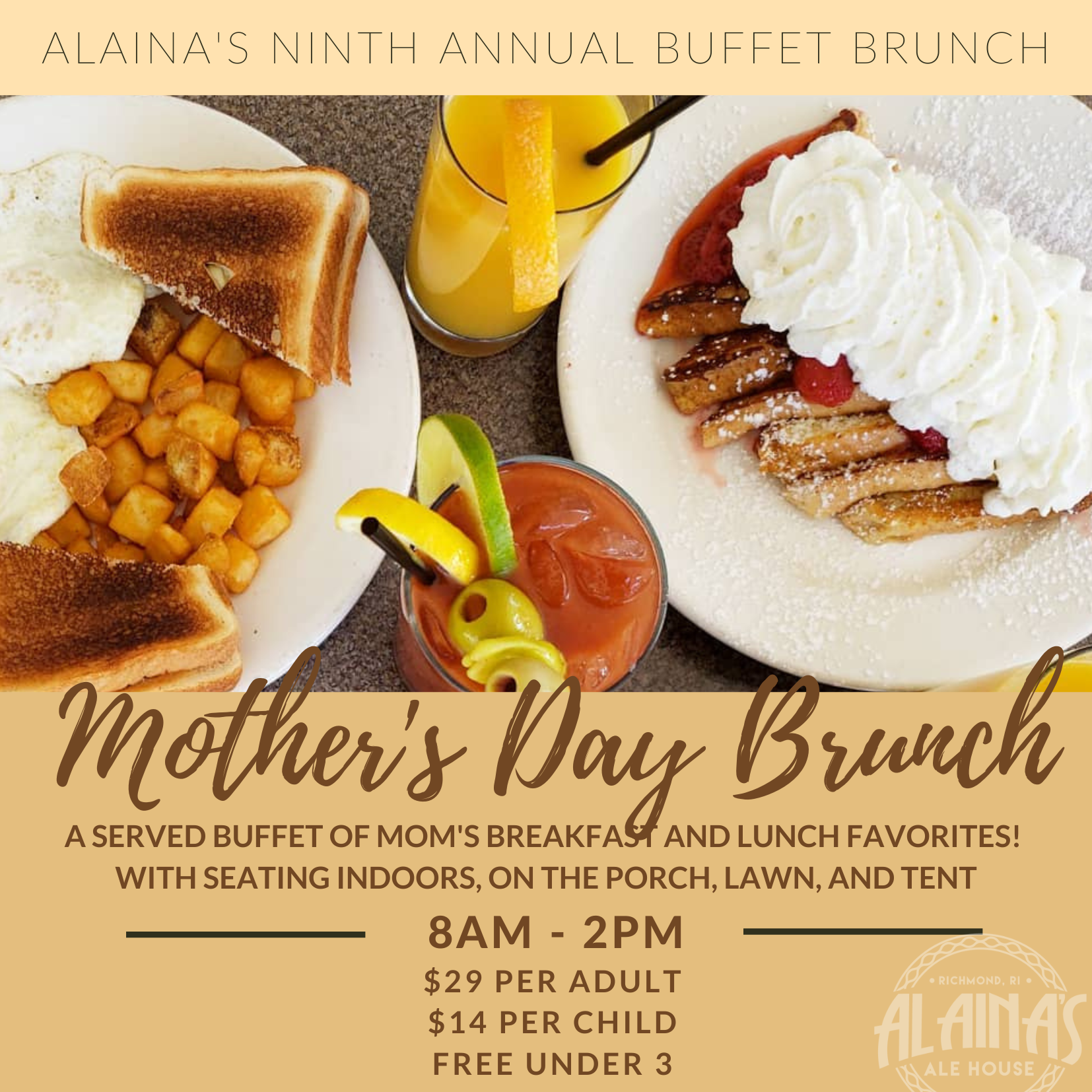 Treat Mom to our 9th Annual Mother’s Day Brunch Buffet with seating in the restaurant, on our covered famers porch, or in the tent!
